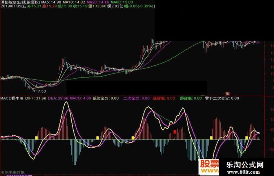 低位金叉:IF(CROSS(DIFF,DEA) AND DIFF<-0.1,0.3,0),COLORYELLOW,POINTDOT;