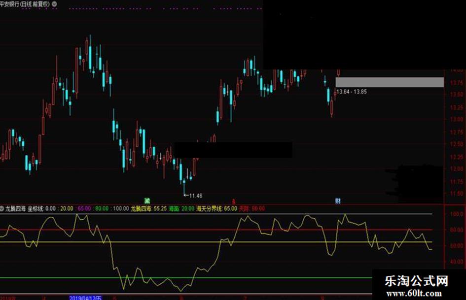 N:=8; 坐标线:0;20;65;80;100; 龙腾四海:100-100*(HHV(HIGH,5*N)-CLOSE)/(HHV(HIGH,5*N)-LLV(LOW,5*N)),COLOR00FFFF; 海面:20,colorgreen; 海天分界线:65,coloryellow; 天际:80,colorred;