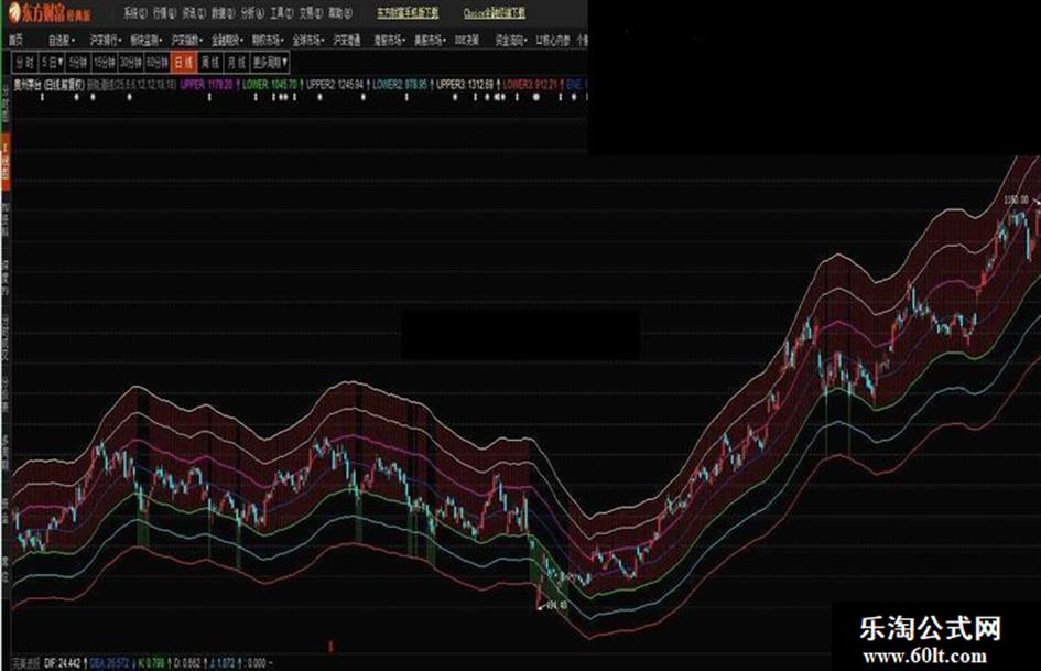 今天这个是我直接在东方财富通上原创的,以轨道线指标为基础,写了一个新轨道线指标