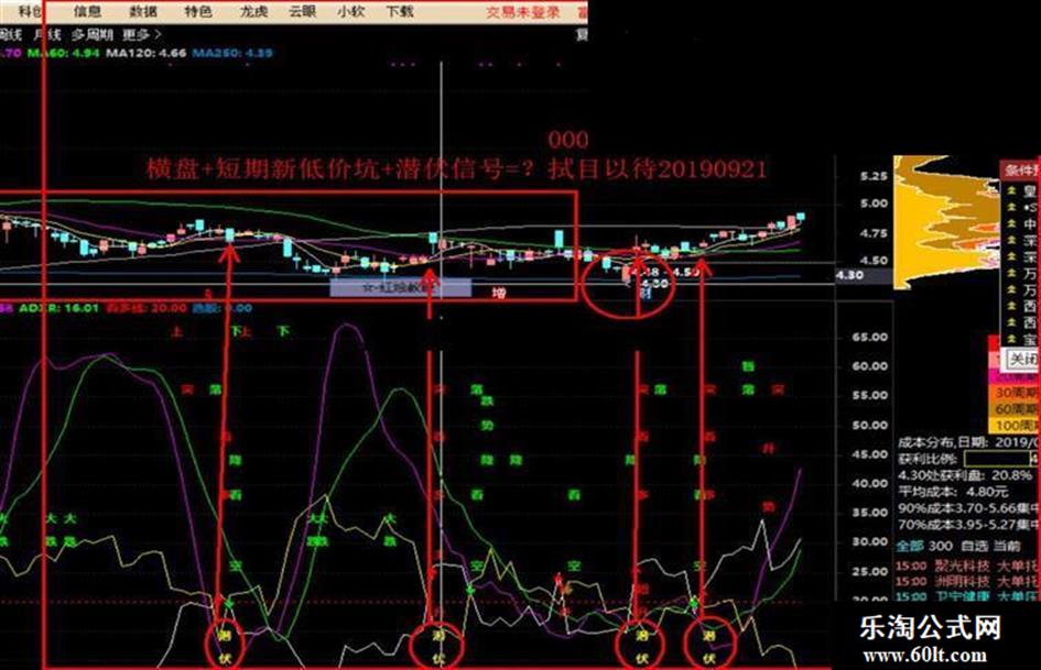 3.潜伏信号:潜伏信号我做成了一个选股公式,但不是所有信号都能成功,世界上没有一劳永逸的指标,也没有一成不变操盘的庄家主力,所以不要指望所有信号都管用,但选股选出数量已经相当少了,一般不超过20个。大家可以运用指标副图对照看过去的票,仿照副图说明,形成自己的选股模型:比如横盘+短期最低价+黄金坑+潜伏信号=暴涨......,这个需要自己反复去总结,相信各人有个人的妙用。