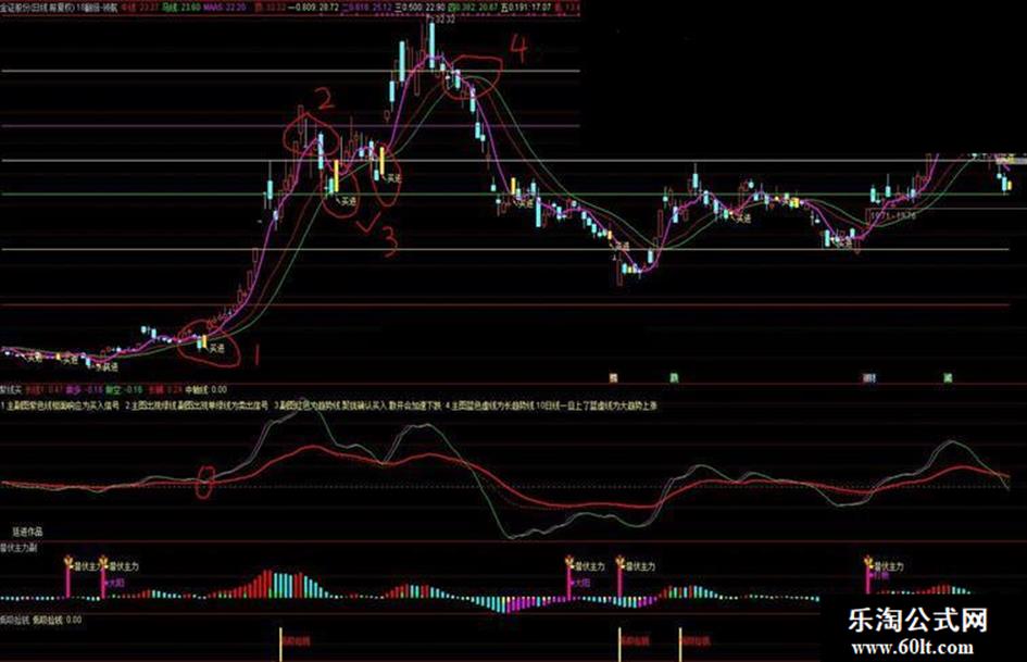 本指标为主图,图中各线为各阶段压力线,股价上涨,紫线在上!!!低位出现买点坚决买入!!!长期自用