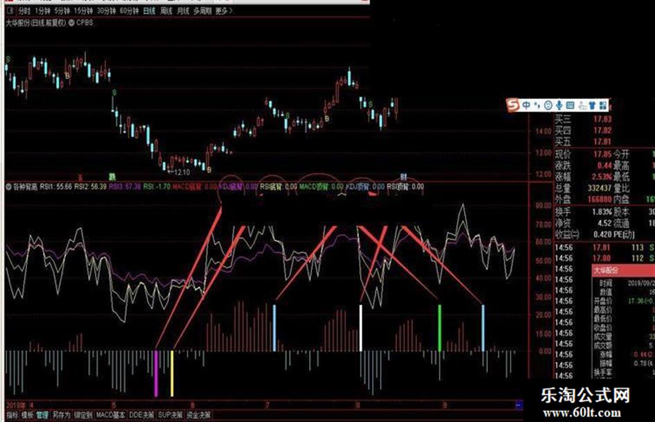 这个指标 可以抓各种顶底背离 方便分析 配合其他指标用着感觉很不错 下面上图 图中各种颜色的柱子表示不同的背离 具体图上箭头有标示 自己看下就知道了
