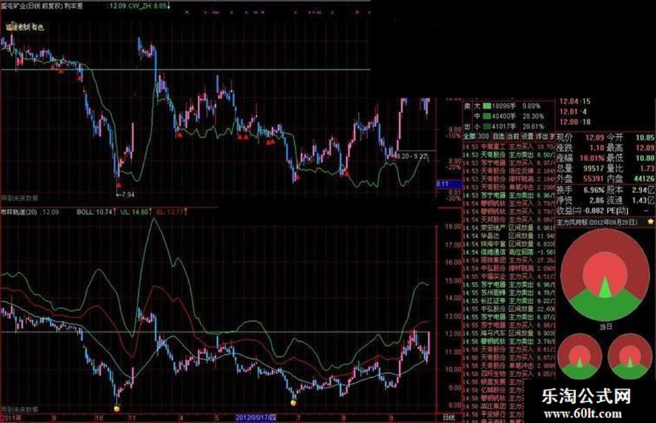 说明:本指标注重的是买点。股价沿着中轨上升系强势涨升,一旦接近上轨注意及时止盈。中轨与上轨几乎并线则预示股价涨势过快,头部不远。随时注意止盈。大部分情况下股价上穿下轨系比较好的买点。上穿中轨则进入拉升阶段。沿着中轨持续上涨的个股一般都有比较好的涨幅。使用中注意观察