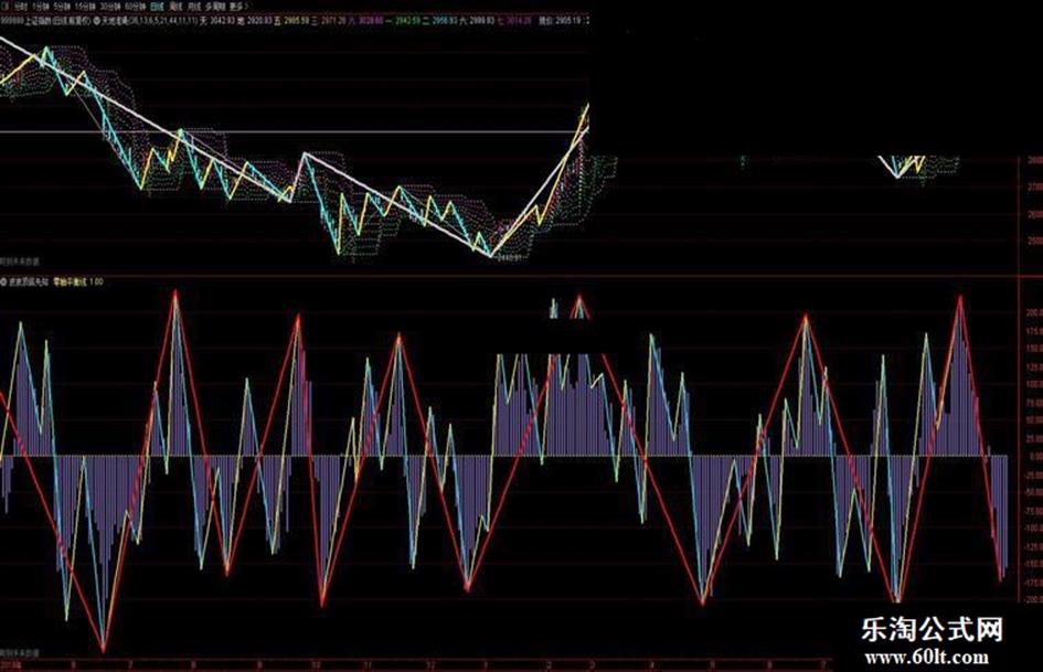最近爱玩波浪理论,,,研究大量波浪指标, 发现大部分波浪指标都是主图的,所以我干脆做了一个副图的. 因为波浪理论做成指标基本都得用自动划线,,,,一用自动划线就带未来函数,介意的可以不用. 其实不管你用不用未来函数,波浪是不变的,就从那儿摆着呢,,,不用自动划线也能看出来,,,用上自动划线能看的更清楚.