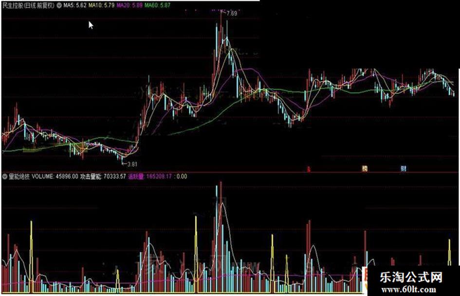 VOLUME:VOL,VOLSTICK; 攻击量能:MA(VOLUME,5)COLORWHITE; 活跃量:EMA(VOL,250)COLORMAGENTA; IF(CROSS(0.9,1/VOL*1000>0.01 AND "KDJ.J"<0),VOLUME*5,0),COLORYELLOW,LINETHICK2;