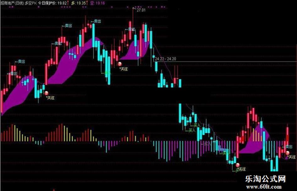 指标中,将学员们常用的多空指标进行立体并用彩带进行美化,增加了观赏性和实用性。同时将收盘价的走势在图中以小彩柱形式显示,配合主指标共同提供买卖操盘的依据。还是那句话:指标是死的,人是活的,千万别当真,只供参考用。