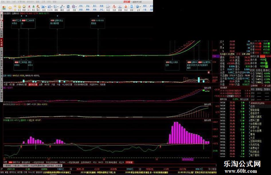 用法自己琢磨了不多说了 CCI过线上牛和MACD金叉共振 买入 选股买红线黄线两线之间的股票。一旦CCi 上 100就进入强势区。手机上无法显示买进卖出 自己看!