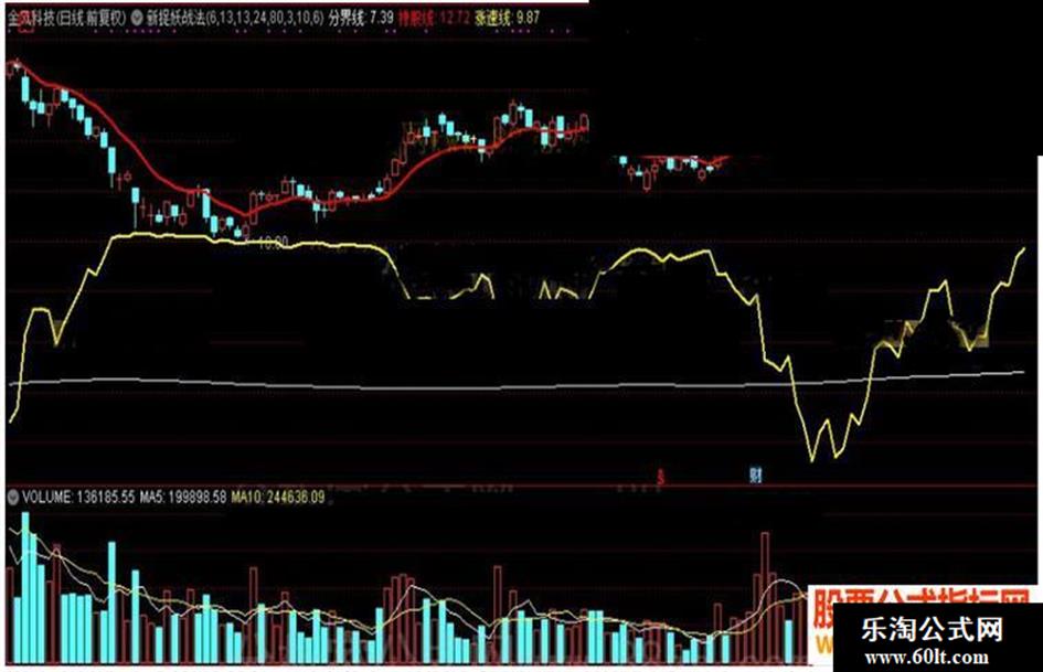 涨速线:(IF(((VAR5) < 分界线) AND ((VAR5) < (C * (0.15))),分界线 * (0.85),VAR5)),LINETHICK2,COLORYELLOW;{临界线};