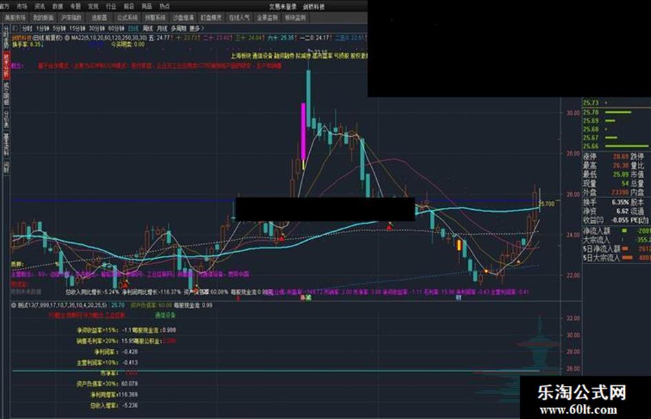 指标简单明了。副图筹码优势明显,可以更清晰直观看清当前价格所在筹码位置,图中青色线为当前价格所在的筹码位置 在图的左侧加入财务数据,优秀的财务数据用红字突出显示