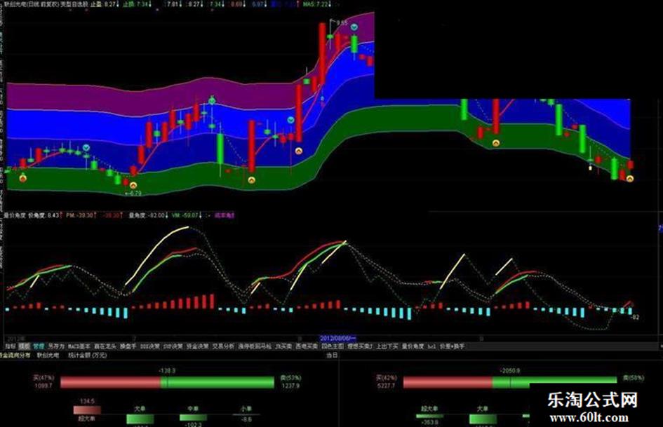 我想重点说说图上的四区颜色就是因为我们编辑公式的出发点是想告诉使用公式的人能够知道什么时候是考虑买卖股票的机会.关键还是紫色和绿色股价一旦进入这个范围就是考虑买卖的时间.他不能告诉你必然的结果.但是可以提醒你是考虑的时机.没有任何公式可以百分之百确认买卖点.给你个大概几率就很好了.公式本身就是说明历史的.公式右边永远是未来函数.所以别指望公式给你定心丸.主意就在你心里.问谁也于事无补.朋友这就是我的忠告.