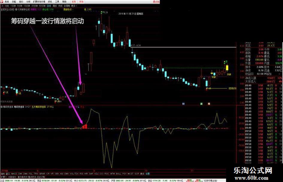 关注:IF(筹码穿透率>8 AND (换手>2 OR C/REF(C,1)>1.098),1,DRAWNULL),NODRAW,COLORRED;
