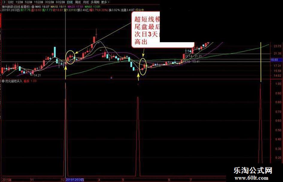优化超短买入 自己研发的超级短线买入指标体系,特点: 1,出信号后,尾盘入(盘中会信息消失的可能,毕竟收盘价附近的价位才定性信号有无); 2,出信号后,3天内利用盘中冲高的过程获利0.5%以及以上离场; 3,异常情况,严格止损;