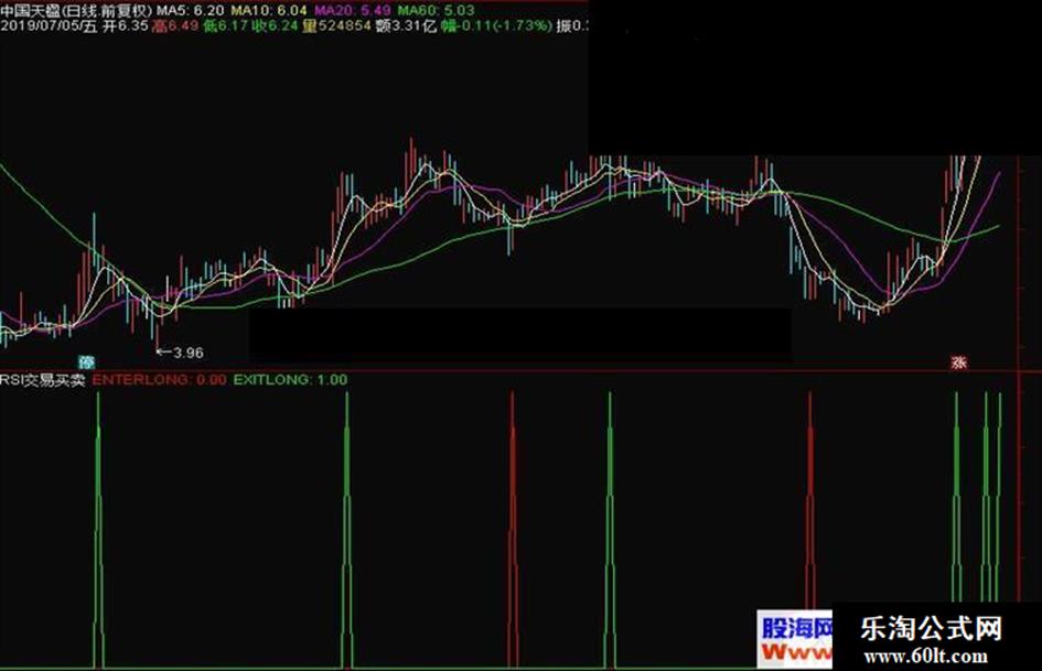 N1:=6;LL1:=20;LH1:=80; WQ:="RSI.RSI1"(N1,2,2); ENTERLONG:CROSS(WQ,LL1),COLORRED; EXITLONG:CROSS(LH1,WQ),COLORGREEN;