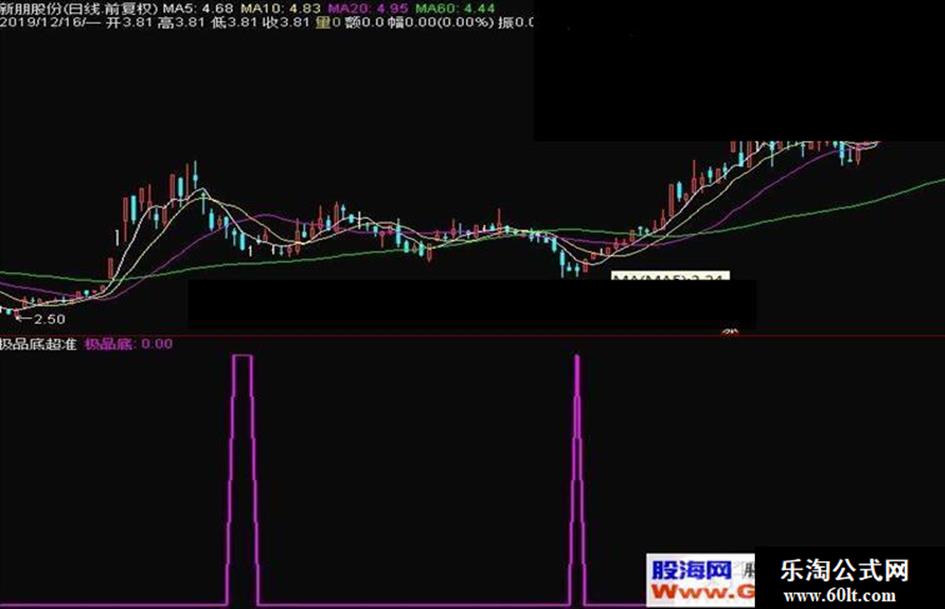 极品底:IF((MA(C,5)-C)/C>0.04 AND (MA(C,10)-MA(C,5))/MA(C,5)>0.04,23,0),LINETHICK2,COLORFF00FF;