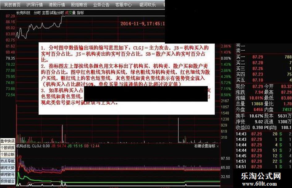 4. 当天开盘后1小时内,如果在沪深A股报价涨幅的降序排列中发现有个股的机构买入占比超过60%,而且出现强势的紫竖线和黄竖线,此类个股为当天能够涨停的强势股,应该重点关注。