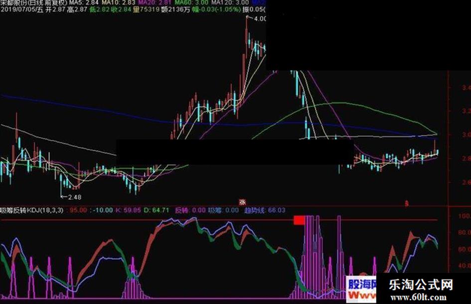 反转:IF(FILTER(KDJ1 AND KDJ2,3),50,0),COLORMAGENTA,LINETHICK2;