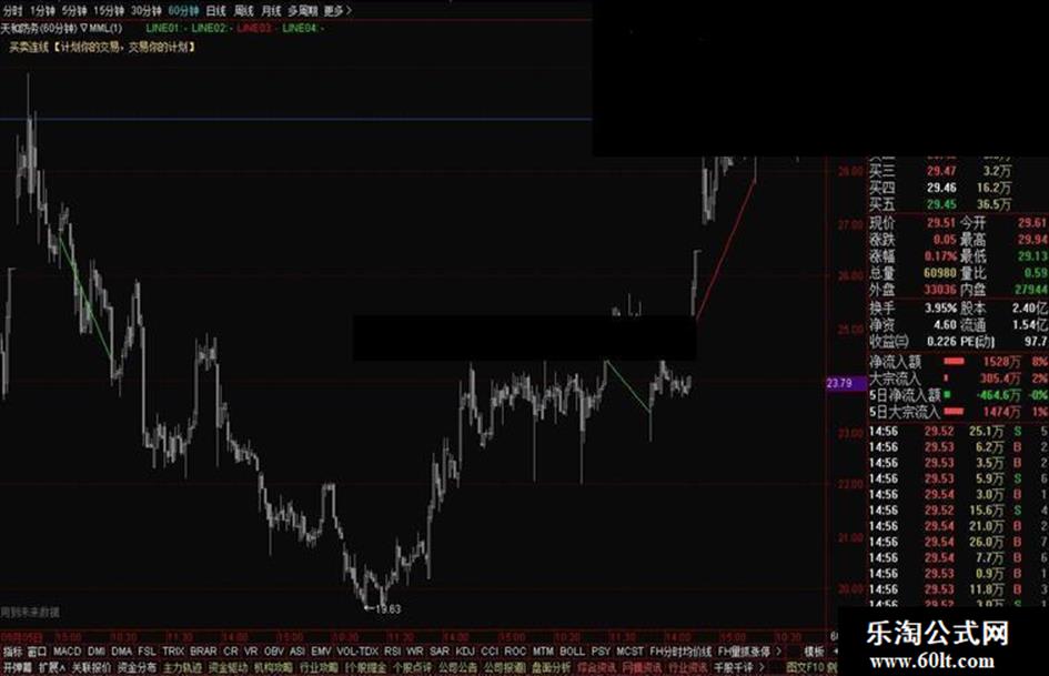 7、将软件压缩包中的“通达信买卖连线.tn6”导入到通达信行情软件中,选择该股票,键盘输入”MML”即可启用“买卖连线”指标,用ALT+S调出公式编辑器,全选该指标的代码,然后将剪贴板上的通达信代码粘贴进 公式编辑器,点确定即可在K线图上看到买卖连线。