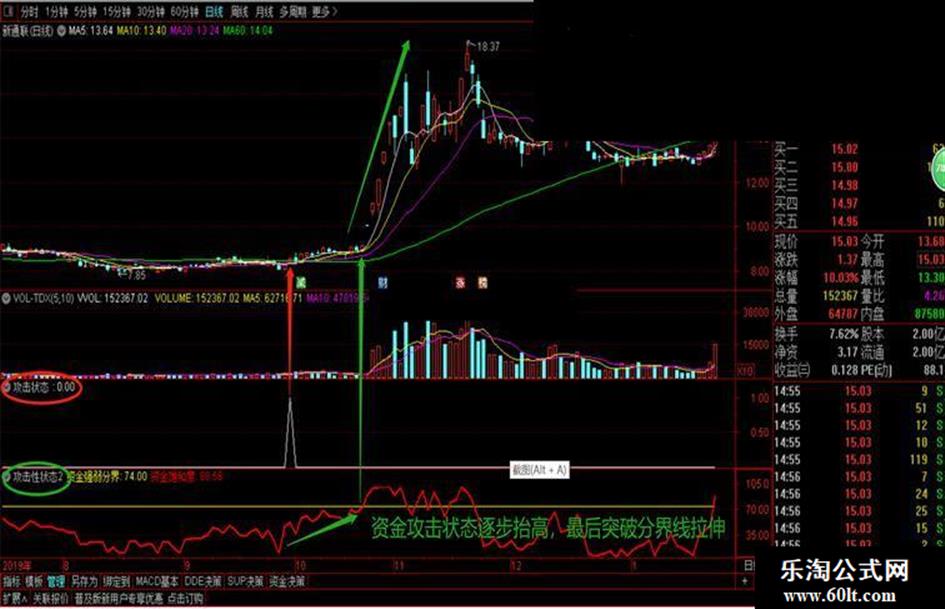 图1,技术攻击形态先发出信号,然后资金介入状态指标逐步提升,最后突破分界线,主力迅速拉升。