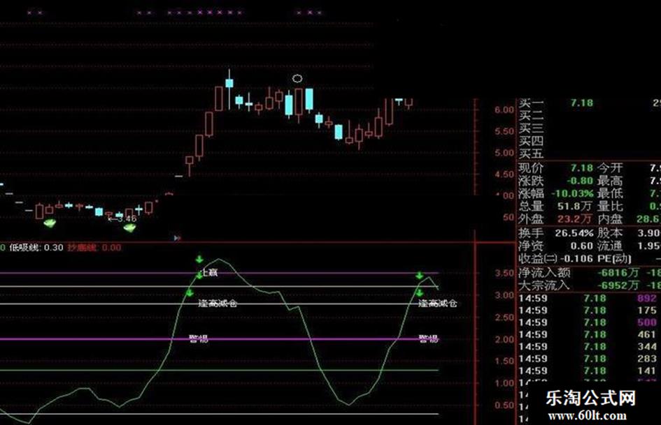 在次与大家分享一个 比较实用的公式 提示很简单 当动力线处于 低吸线 勾头向上 即可买入 处于 警戒线 上方勾头向下即可卖出 准确度高 非常适用 副图