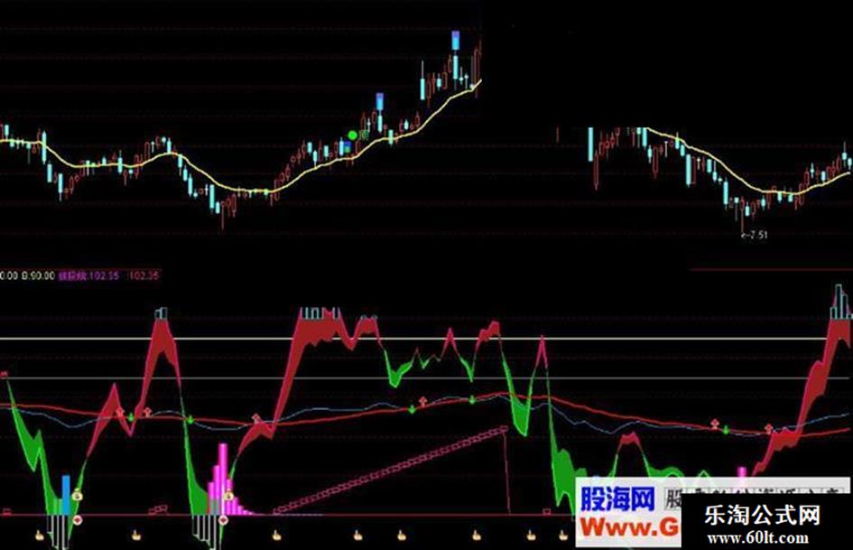 3、90以上的兰色和绿色柱是顶部提示,但出现兰色柱后,红色波段线在85以上,同时粘合K线持续上升,则可以持有,股价还有相当的上涨空间。