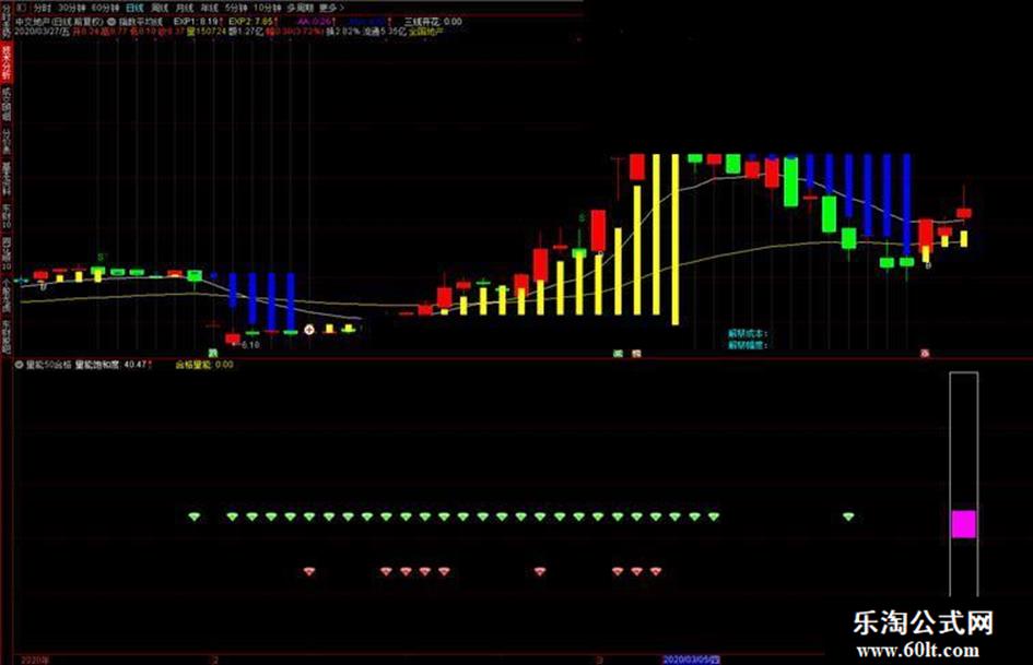 量能大于50,有绿宝石。 量能等于100,显示红宝石。 量能小于30,量柱为绿色;(疏忽参数设置错误,请把50改为0) 大于等于30,小于40,量柱为黄色;(疏忽参数设置错误,请把50改为0) 大于等于40,小于50,量柱为紫色;(疏忽参数设置错误,请把50改为0) 大于等于50,量柱为红色。