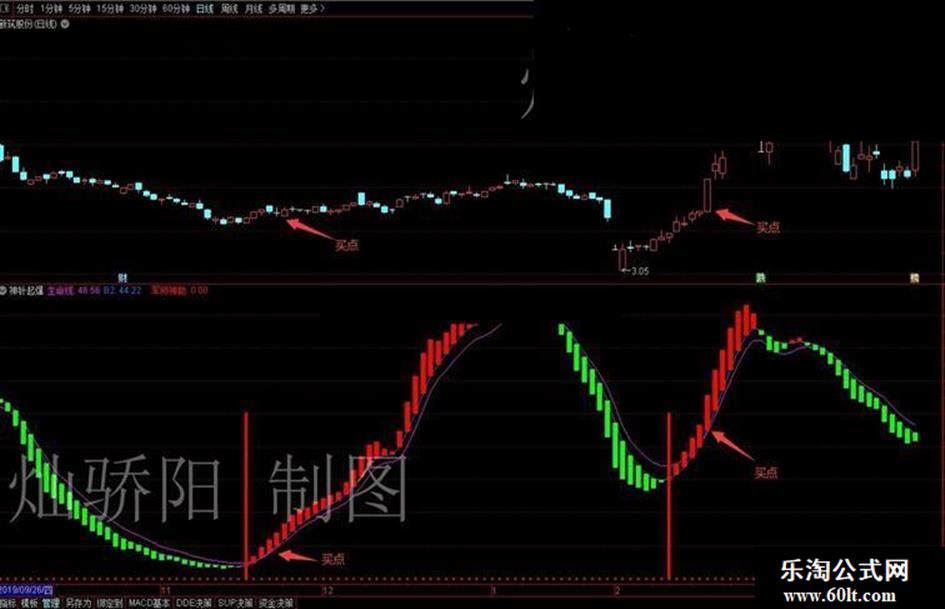 同一个指标,在不同的人手里,效果是完全不一样的,很多人只看表面出现的信号,自己没研究,或发布者没详细介绍使用方法,本来很好的指标,结果用起来处处是坑,其实指标想说:“世界上没有100%成功率的指标,但我也算个优质或精品指标啊,这种锅我不背”。所以我会尽可能详细说明指标用法。 此指标用法得当的话,中短线胜率非常高,很直观,很简单,没那么多花里胡哨和五颜六色。 买点:出现红色金针后,蓝线上穿紫线(必须要有效上穿,粘合不算)