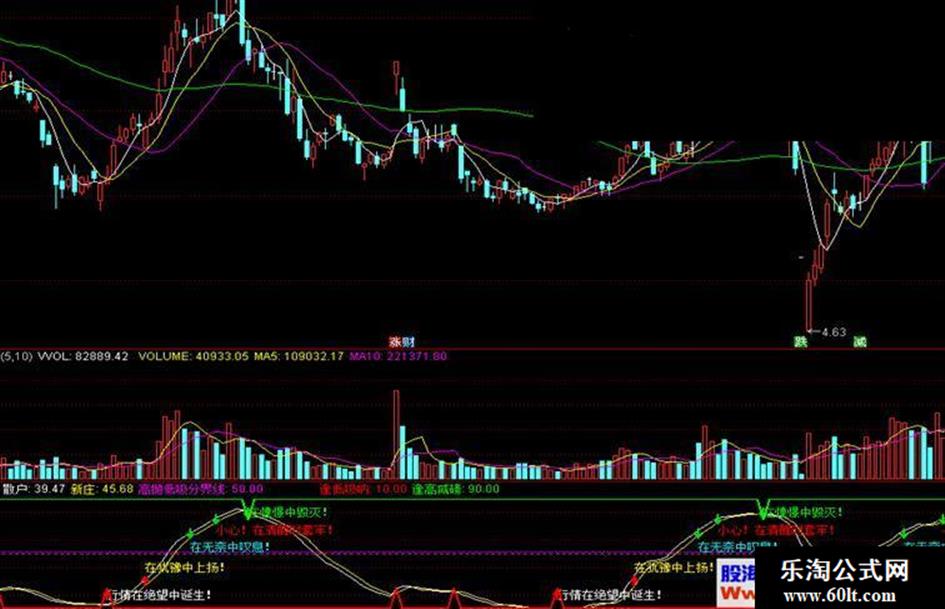 DRAWTEXT(CROSS(散户,新庄) AND 散户<22,20,'行情在绝望中诞生!'),colorwhite, ;