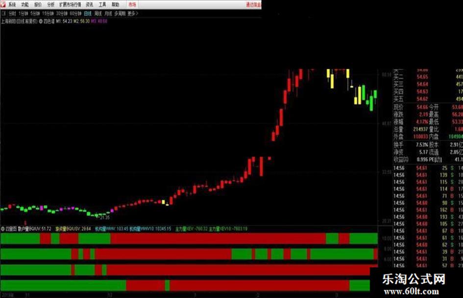 四量图:由股市中判断量能变化的经典指标结合而成,指标中在同一天内有两个区域是红色,代表个股受到量能支持,股价有机会持续上涨。指标中不能只有一个区域为红色,这代表量能不足。当两个以上区域为红色时,任意一个区域颜色变绿都代表减仓信号。有三个区域的颜色变为绿色时即为清仓信号,代表市场已经得不到量能支持。