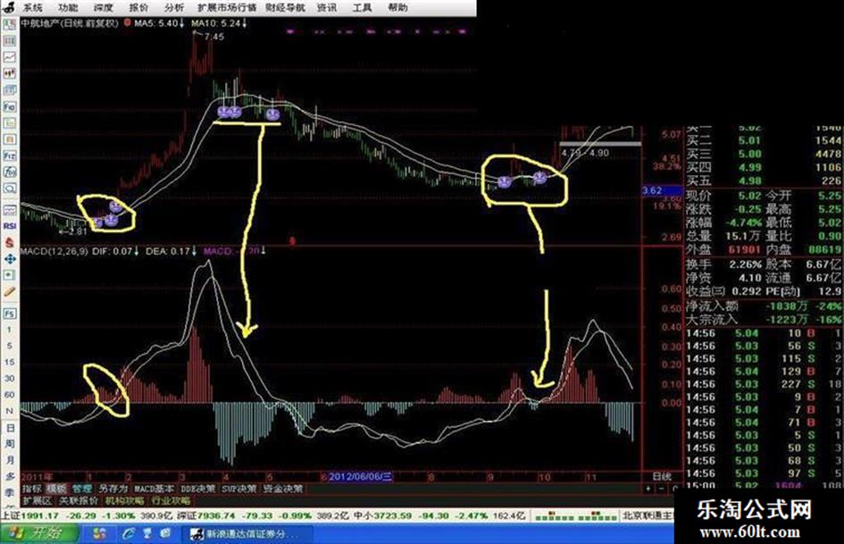 此公式配图为一支地产股,出现信号以MACD翻红,即将浮出水面为好,高位追涨且MACD为死叉状要小心,一般次日获利就要走,拉高出货的股必须这么弄。