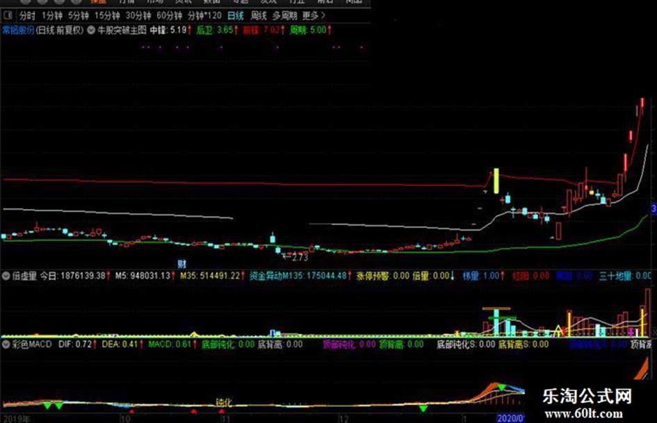 用法:突破红线前锋,可能展开牛股主升浪,下轨线为绿色后卫支撑线,中间是白色的中锋线,突破,支撑和中位线一目了然。 我喜欢简单有效的指标,太复杂的指标临盘决策很恼火,看着眼睛也累。