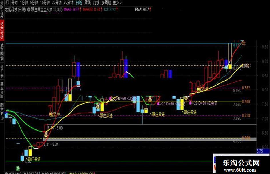 组合主要内容: 1、跟庄买进提示; 2、黄金分割指标; 3、金叉提示; 4、买卖牛熊趋势线; 5、黄柱买蓝柱卖提示。 指标为自组自用,觉得很好而分享给大家。 指标只是协助看盘分析的工具,没有100%准确,不喜好者勿下勿喷。