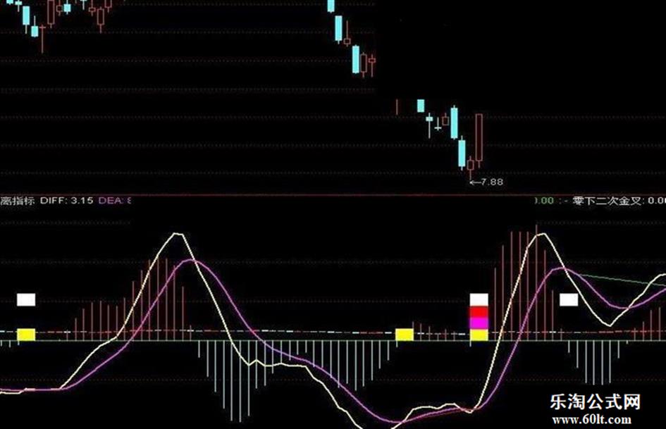 低位金叉:IF(CROSS(DIFF,DEA) AND DIFF<-0.1,0.3,0),COLORYELLOW,POINTDOT;