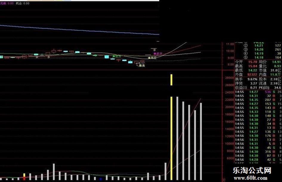 STICKLINE(VOL>MA(VOL,5)*2 AND V>V34*3 AND C<REF(C,1)*1.05,0,VOL,1,0),COLORYELLOW;