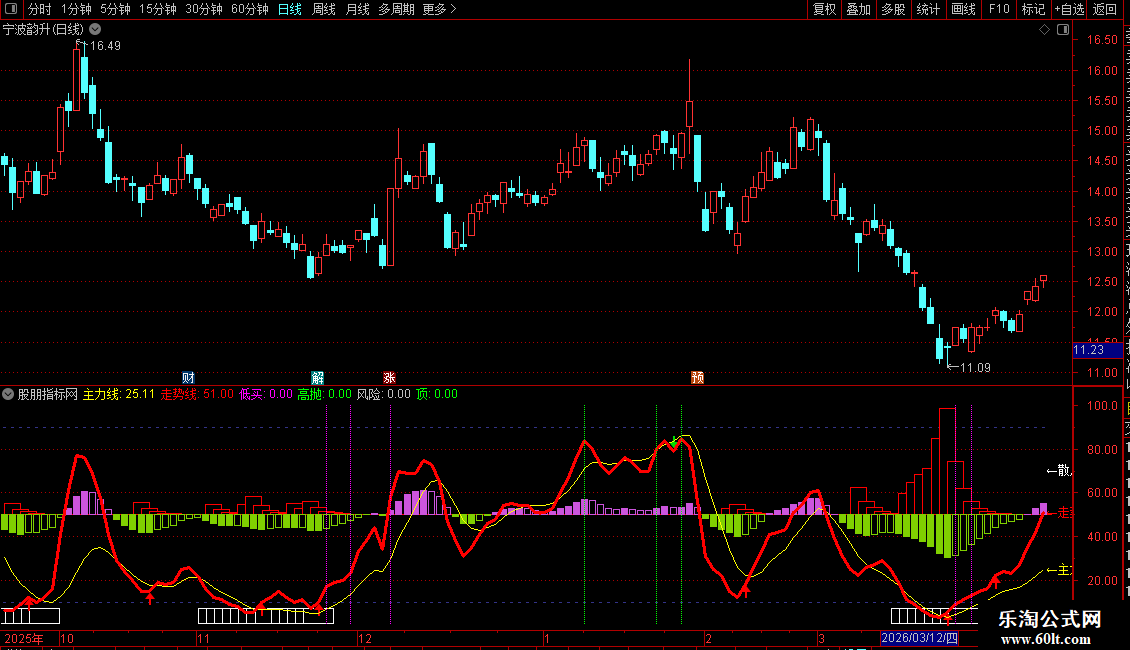 这款副图在配合我昨天发的主图那就是买卖神器我说的主图就是图片上的主图,希望大家不要错过这款好指标,使用方法:走势线上穿主力线为买点,买点和卖点都有箭头提示,绿色的竖杠线也是高抛线 如果说走势线穿越主力线走势完美的话出现了绿色竖杠高抛线也可以拿着不需要立马卖,如果两根线出现拐头向下又出现横杠绿线那就可以先抛了,大家多多研究,时间的关系就不多说了,这款副图放到手机上用感觉更舒服更细腻,电脑上用也很好