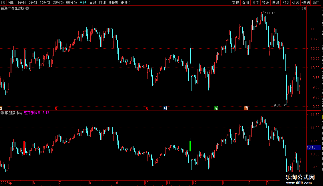 STICKLINE((C=DTPRICE(REF(C,1),BK) AND C=L),C,O,2.6,0),COLOR80FF00;