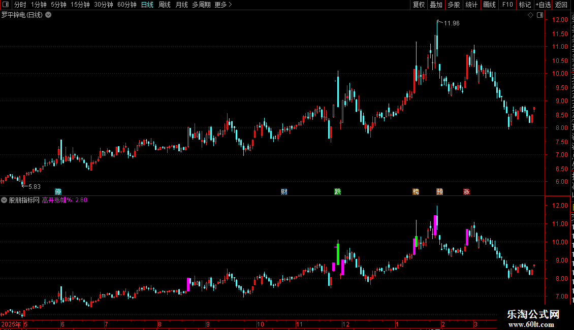 STICKLINE((C=ZTPRICE(REF(C,1),BK1) AND C=H),C,O,2.5,0),COLORMAGENTA;