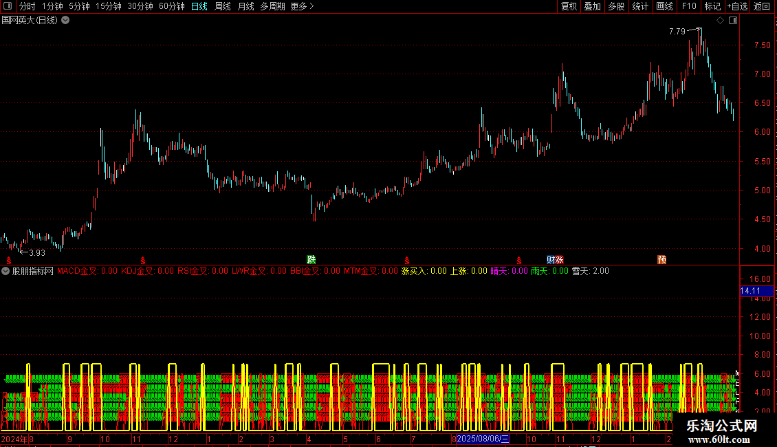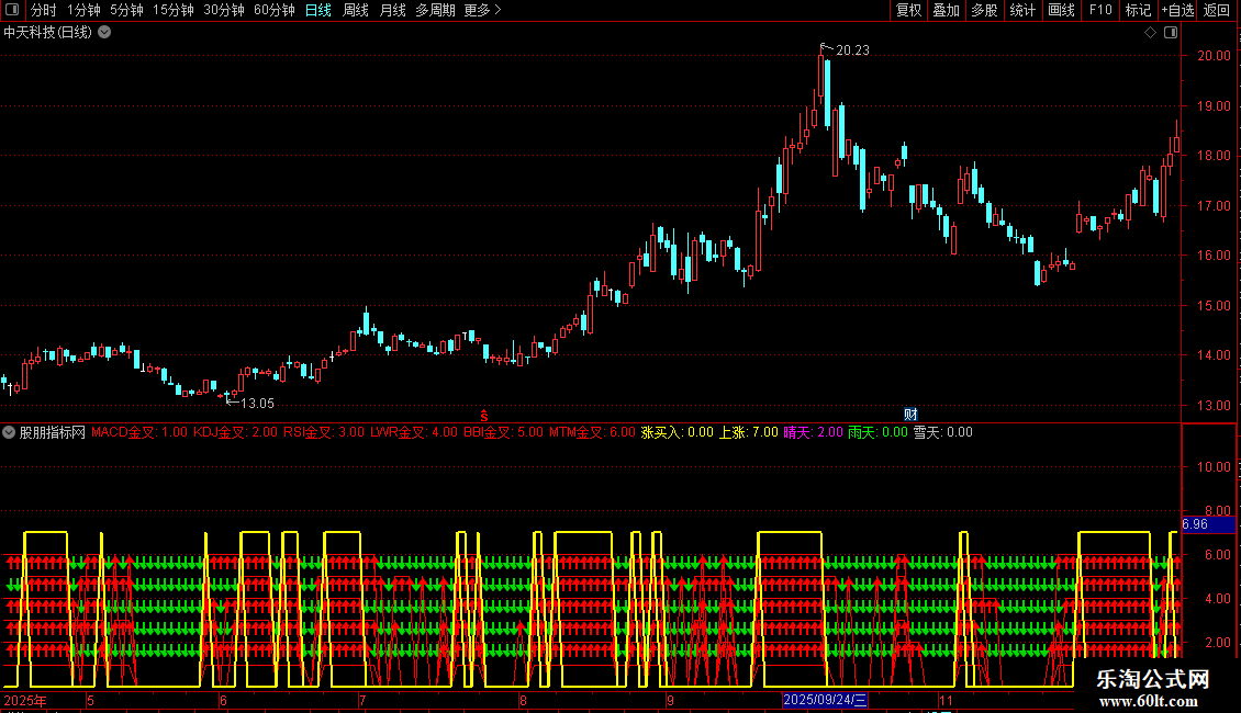上涨:IF(A1 AND A2 AND A3 AND A4 AND A5 AND A6,7,0),COLORYELLOW,LINETHICK2;