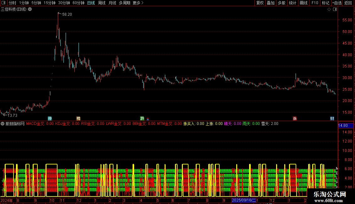 雨天:BARSLASTCOUNT(MACD金叉+KDJ金叉+RSI金叉+LWR金叉+BBI金叉+MTM金叉>0 AND MACD金叉+KDJ金叉+RSI金叉+LWR金叉+BBI金叉+MTM金叉<21 ),LINETHICK0;