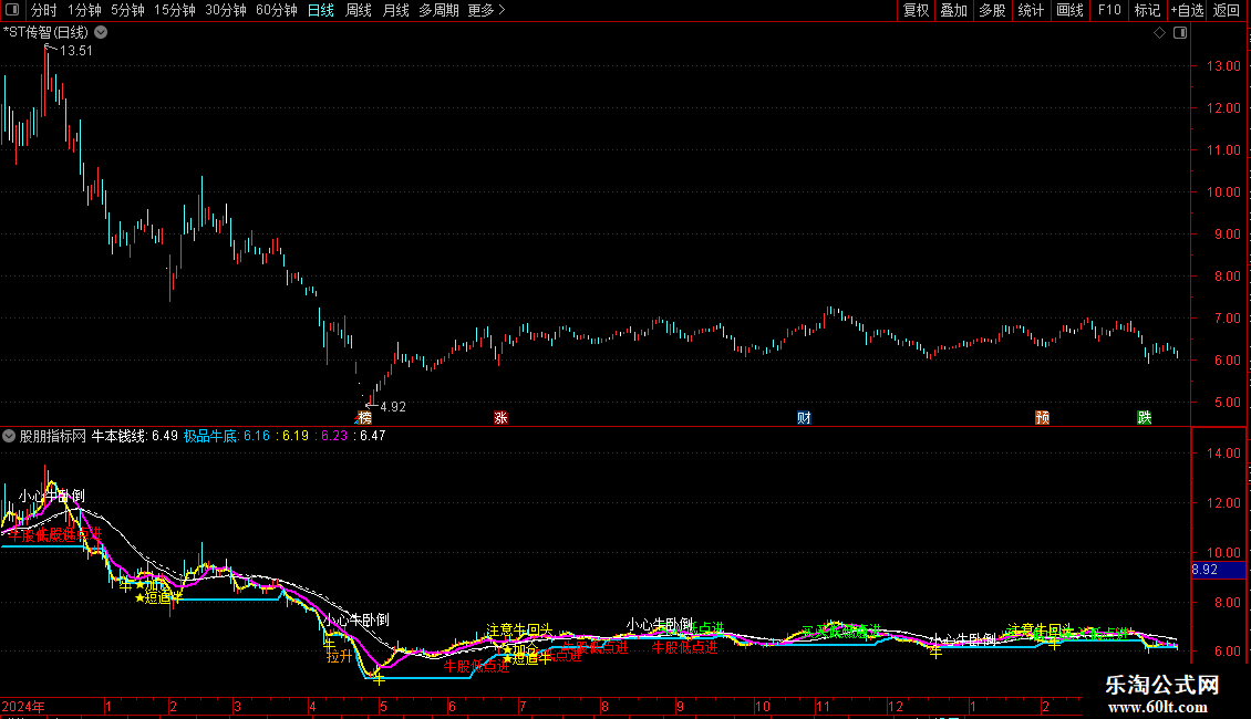 牛本钱线:EMA(X,13),COLORWHITE,DOTLINE;