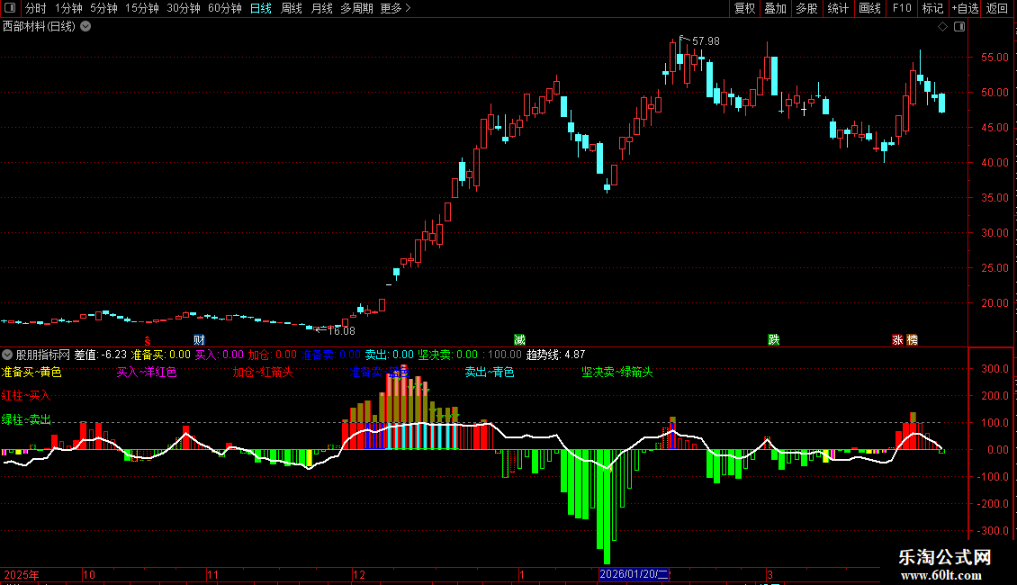 准备卖:IF(差值>60 AND VB>0 AND 中期>50,4,0),COLORBLUE;