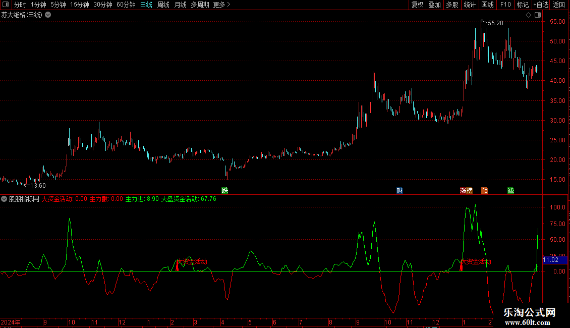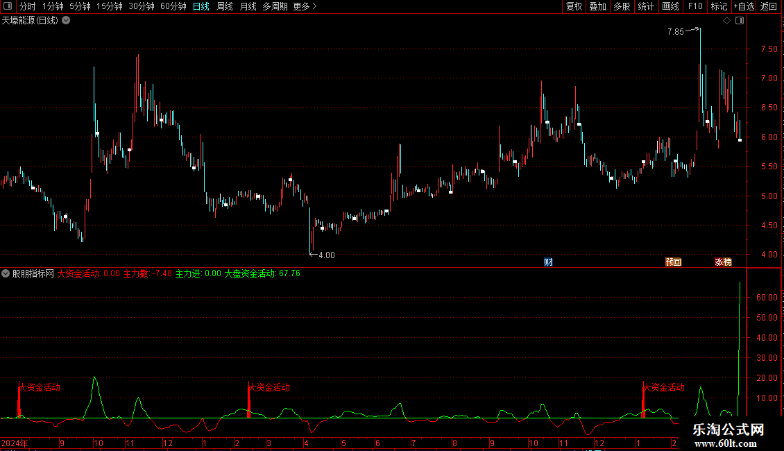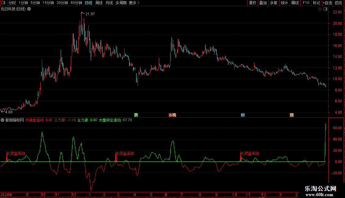DRAWTEXT(VAR20 AND COUNT(VAR20,30)=1,15,'大资金活动'),COLORRED;