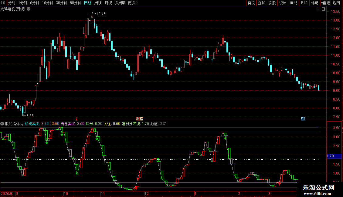 STICKLINE(动力线<=REF(动力线,1) ,动力线 ,REF(动力线,1),3 ,1),COLOR00FF00;