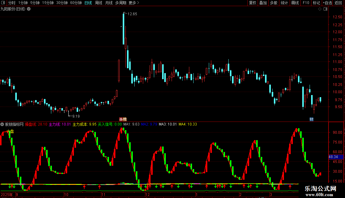 当股票高位时候,“跟主力买”出现死叉时候全部或者部分清仓。操作买股票时候请记住金叉出现顺序:先“跟主力买”,再“MA认主力”(如果两个幅图同时金叉,可以一次性半仓),最后主图金叉。