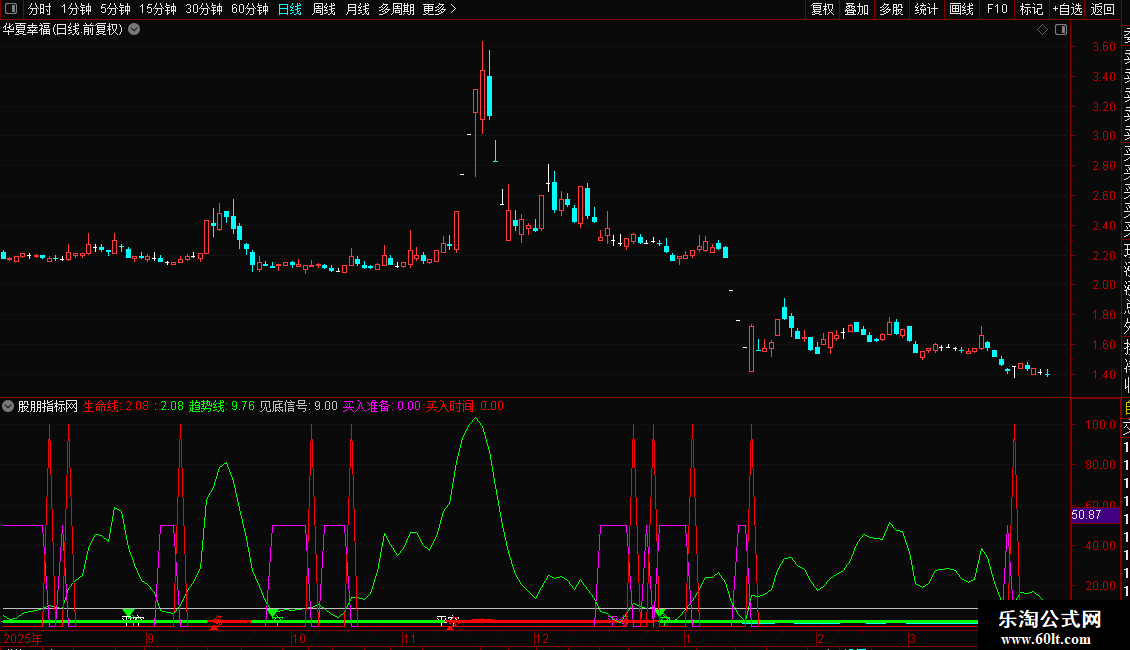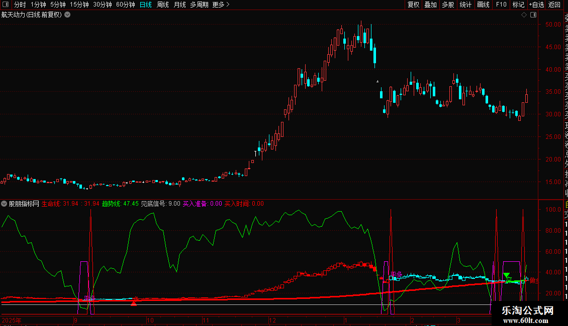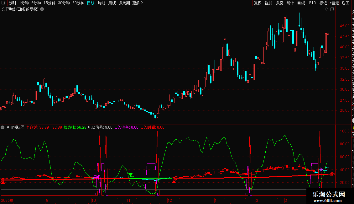 生命线:EMA(MA(C,66),60),LINETHICK2,COLORRED;