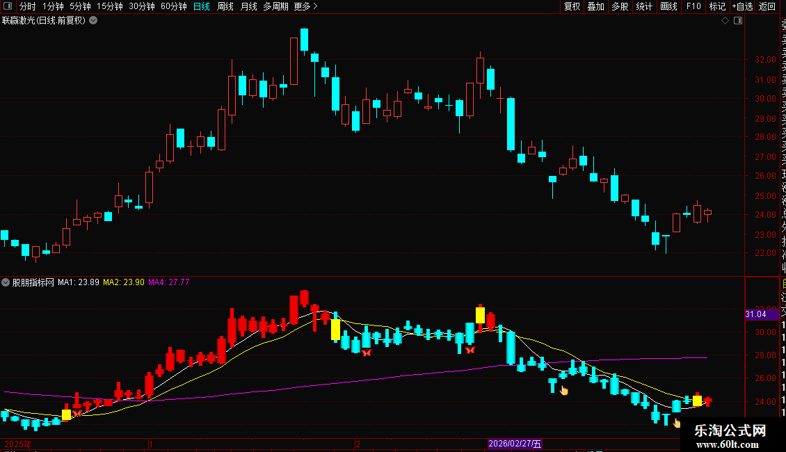 STICKLINE(买线<卖线,LOW,HIGH,1,0),COLORFFFF00;