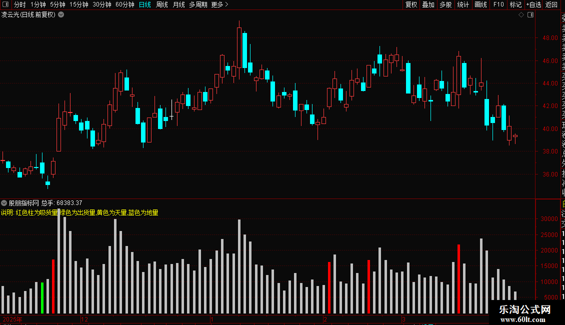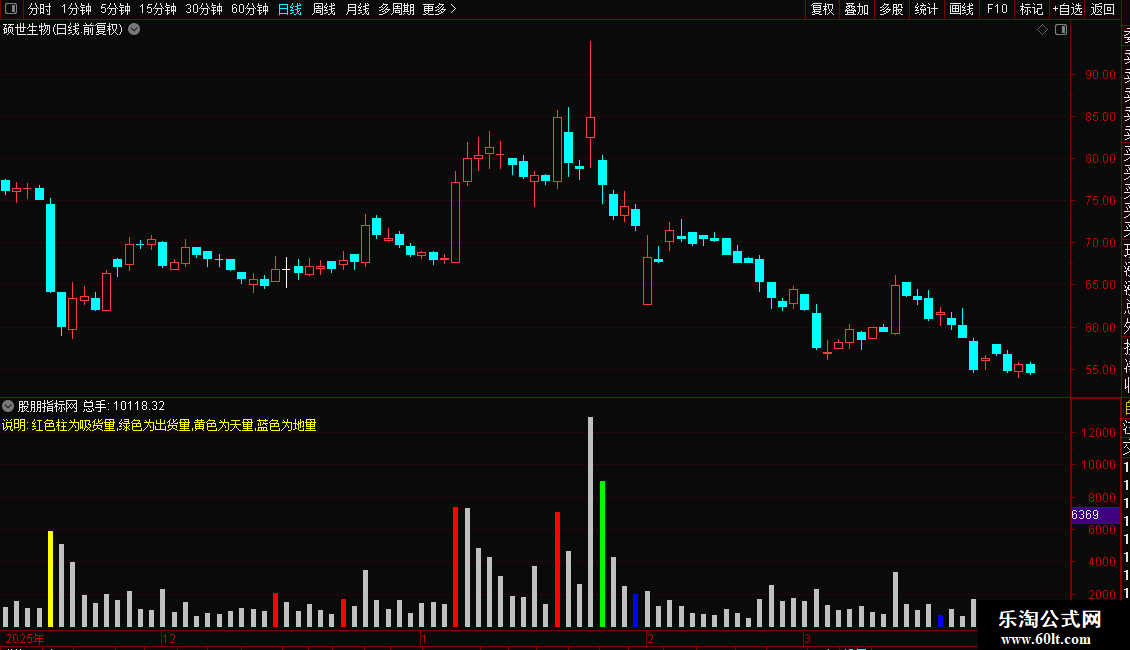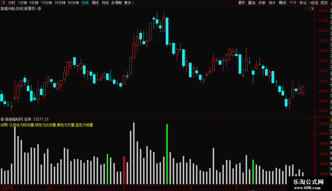 DRAWTEXT_FIX(ISLASTBAR,0,0,0,'说明: 红色柱为吸货量,绿色为出货量,黄色为天量,蓝色为地量'),COLORYELLOW;