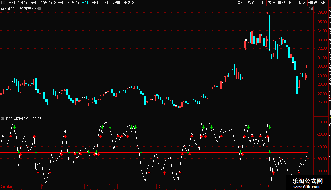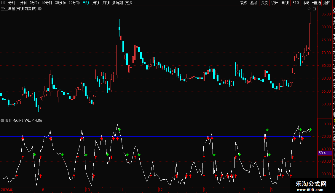用法:WL上穿-80为波段买点,WL下穿-10为波段卖点,WL在-80和-50区间运行为弱势区域,WL在-50和-20区间运行为强势区域。