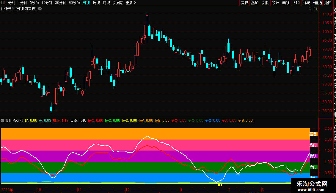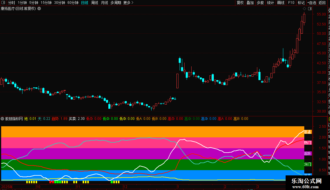 该指标将个股分为五个区域,分别是冰冻、冷门、活跃,热门、高温。众所周知,我们做股票,一般都会选择股性活跃的股票,因为热门股都具有较为活跃的股性,叠加主力入驻的个股通常也具有股性活跃的特点,因此股性活跃的股票,成了投资者的首先,该指标就是按照股性的活跃程度,来辅助大家寻找个股的买卖点。