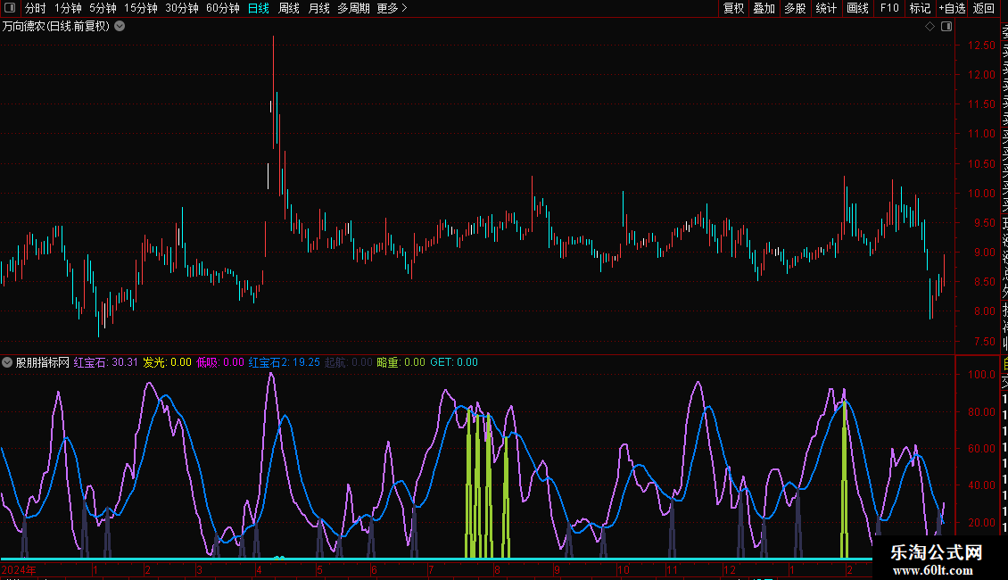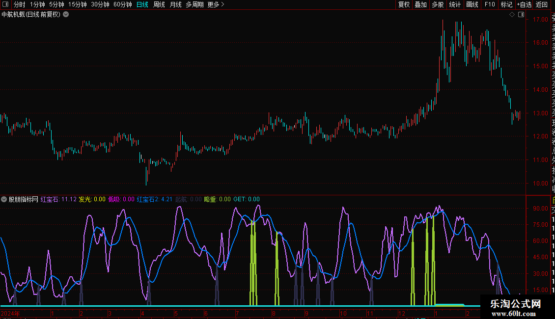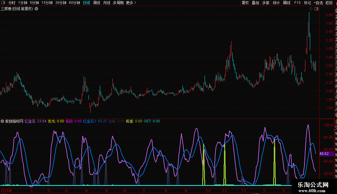 略重:IF(CROSS(红宝石,MA(红宝石,6)) AND 红宝石2>60 AND X_14 AND CLOSE>OPEN,红宝石2,0),COLOR32CD99,LINETHICK3;