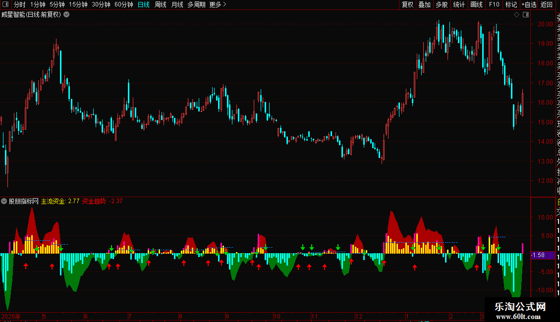 红绿箭头,分别是 买入 和 卖出 参考信号。红绿颜色区域,是资金趋势。红色代表流入占优,绿色是流出占优。